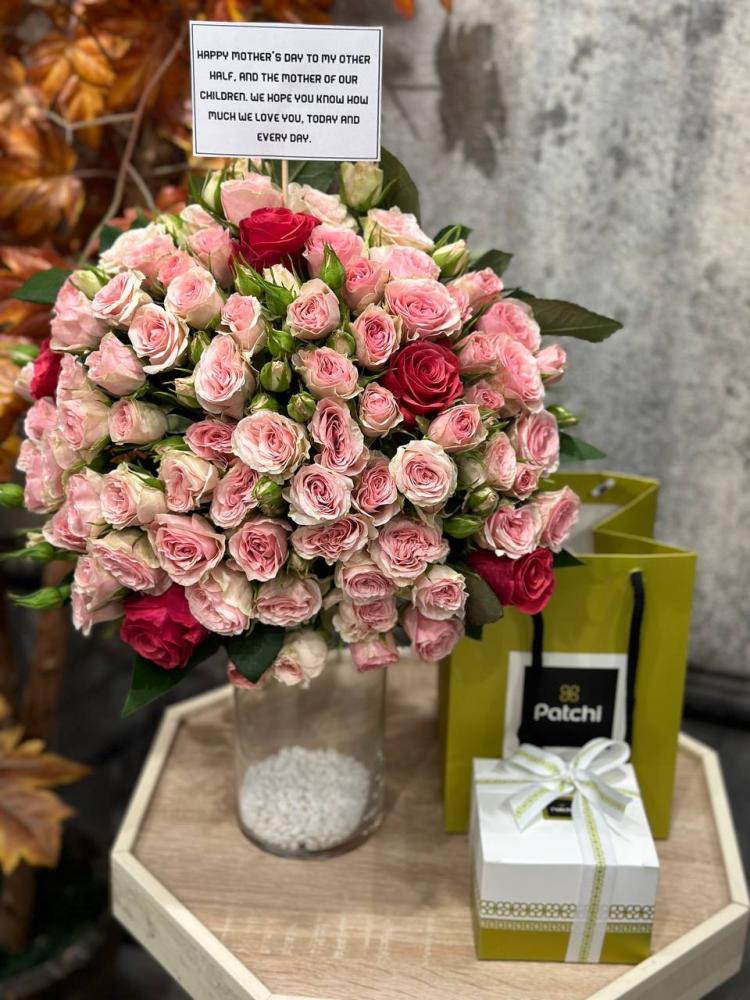 فازة ورد منسقة ب ورد بيبي روز طبيعي مع شوكولاتة باتشي